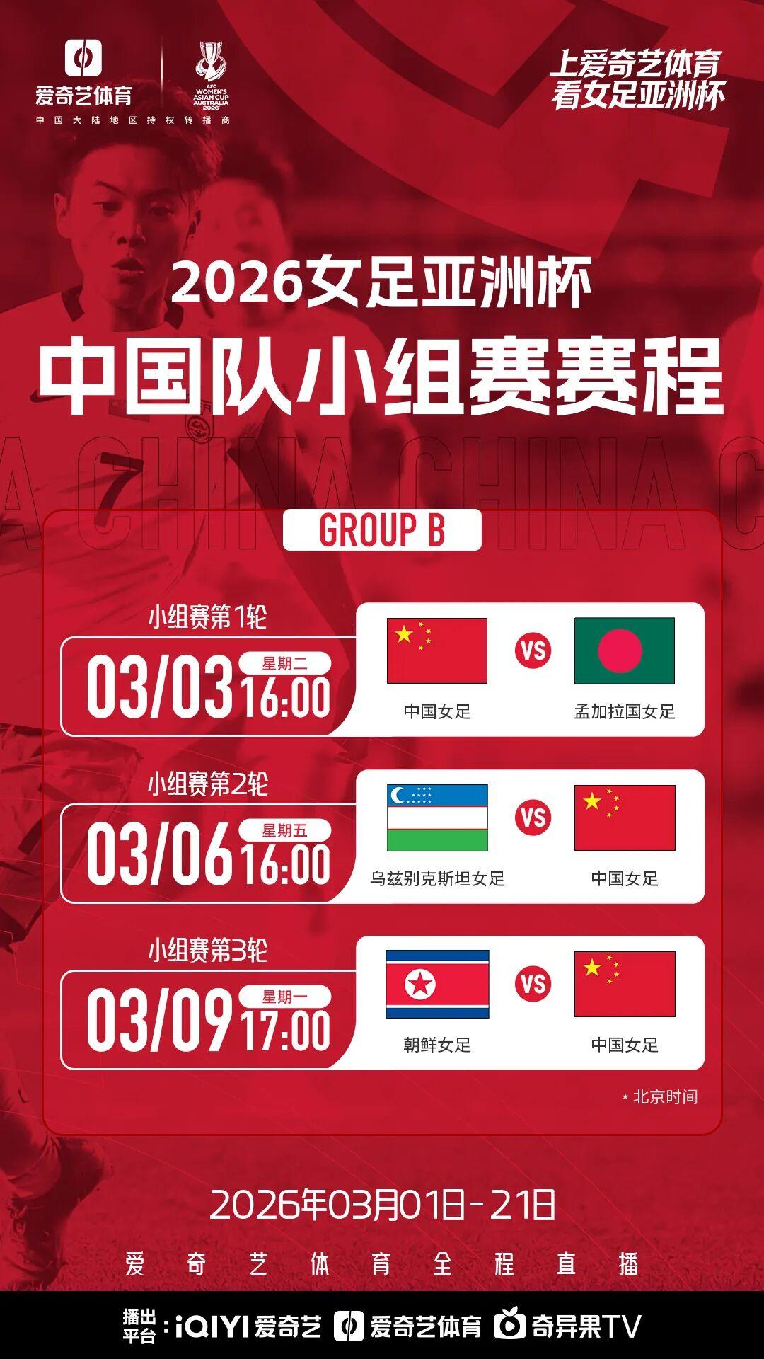 北京时间3月1日,女足亚洲杯将正式拉开战幕,中国女足将在3月3日迎来小组赛首战与孟加拉国的比赛。